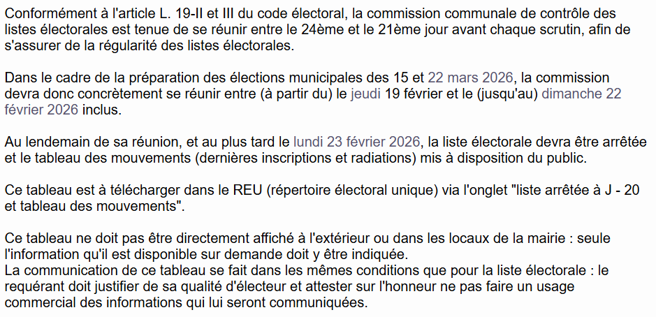 La liste électorale arrêtée à J – 20 et le tableau des mouvements est disponible sur demande auprès du service état civil